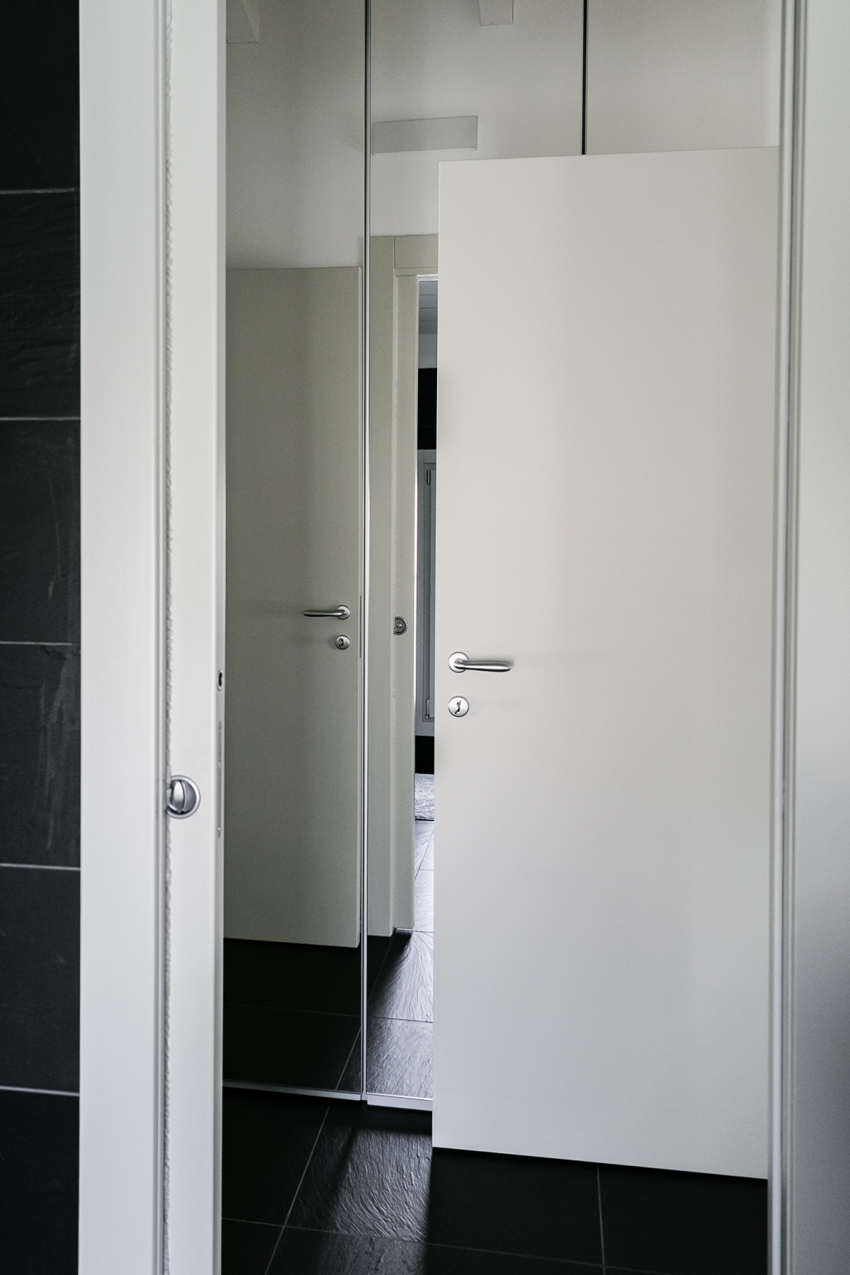 Le porte interne sono state realizzate da noi, sono laccate semiopache sempre grigio tenue, complete di telaio e finiture.